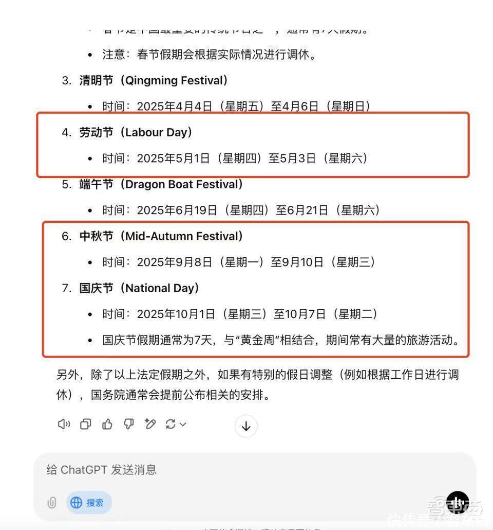 先抛给它们一个有唯一解的问题:“2025年中国的法定假日有哪些?”